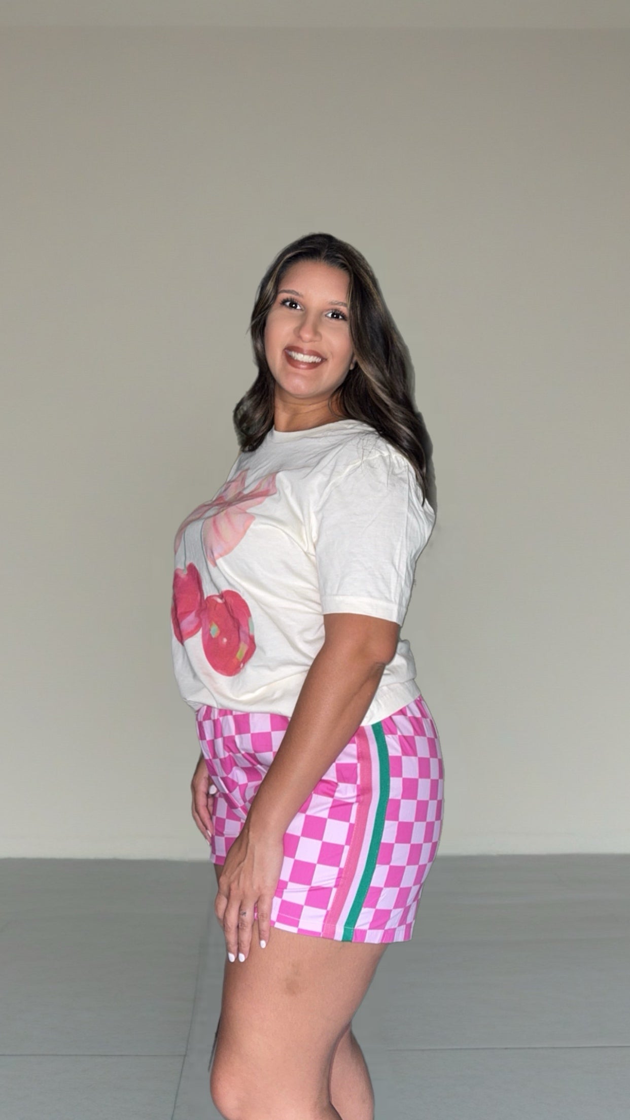 Youβll turn heads in these bold and sassy Check Me Out Shorts! Featuring an eye-catching hot pink checkerboard pattern and sporty green side stripes, these comfy cuties are the perfect blend of retro fun and modern flair. Made with lightweight, breathable fabric and an elastic waistband for that easy, all-day wear.